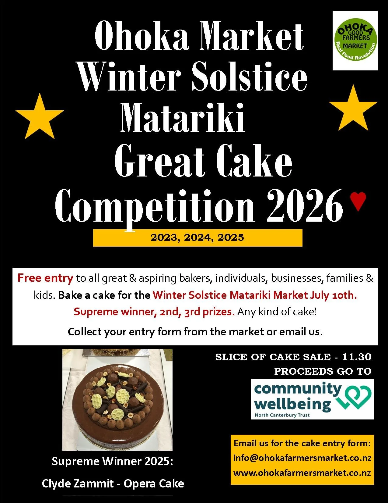 Slices of Cake are sold at the close of the competition award giving and proceeds go to the wonderful North Canterbury Wellbeing Community Trust at $6 slice